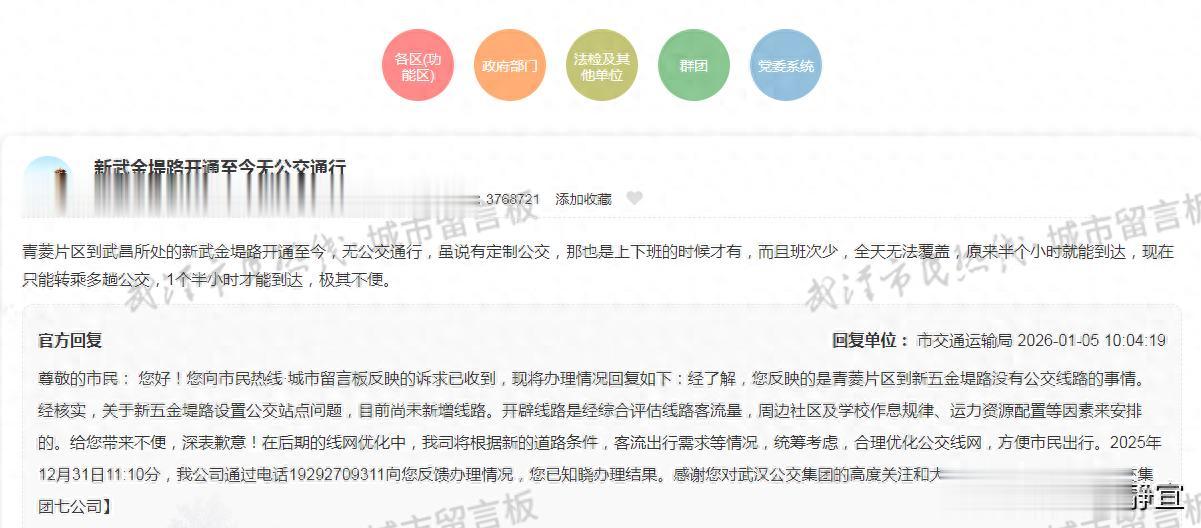 网友反馈 青菱片区到武昌所处的新武金堤路开通至今,无公交通行,虽说有定制公交,那也是上下班的时候才有,而且班次少,全天无法覆盖,原来半个小时就能到达,现在只能转乘多趟公交,1个半小时才能到达,极其不便。