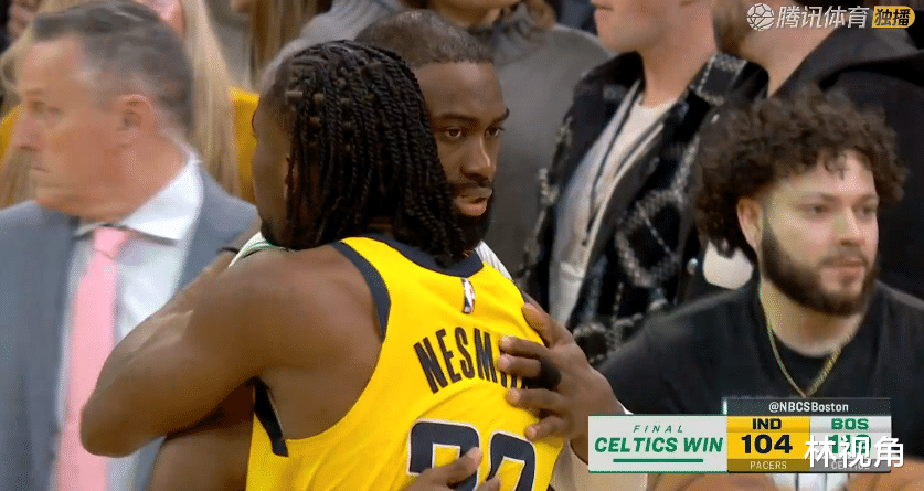 比赛结束,西卡走入场内,和绿军场上球员拥抱致意,绿军这边布朗先是和队友简单聊了几句,然后快步走向步行者替补席方向,一把抱住走过来的内史密斯,与其拥抱致意,双方显得很友好。