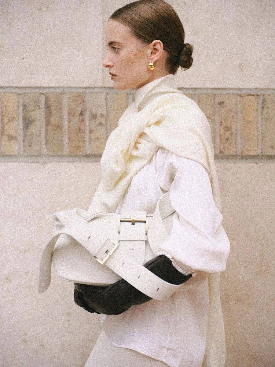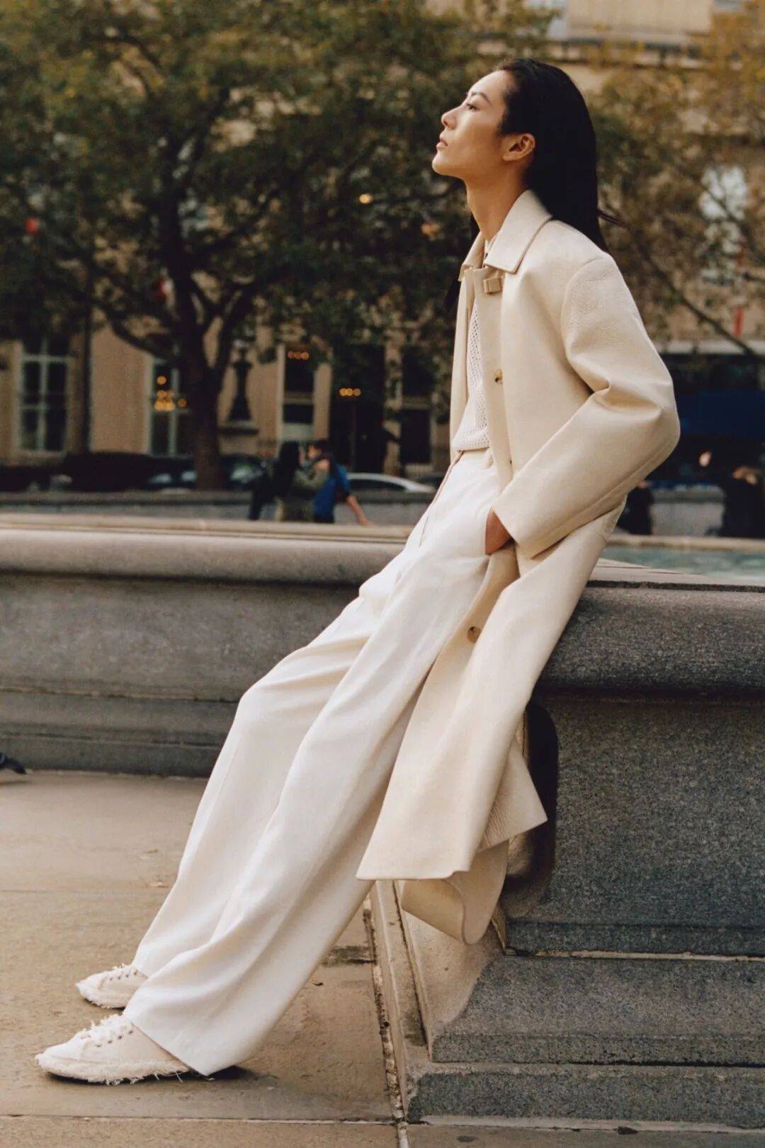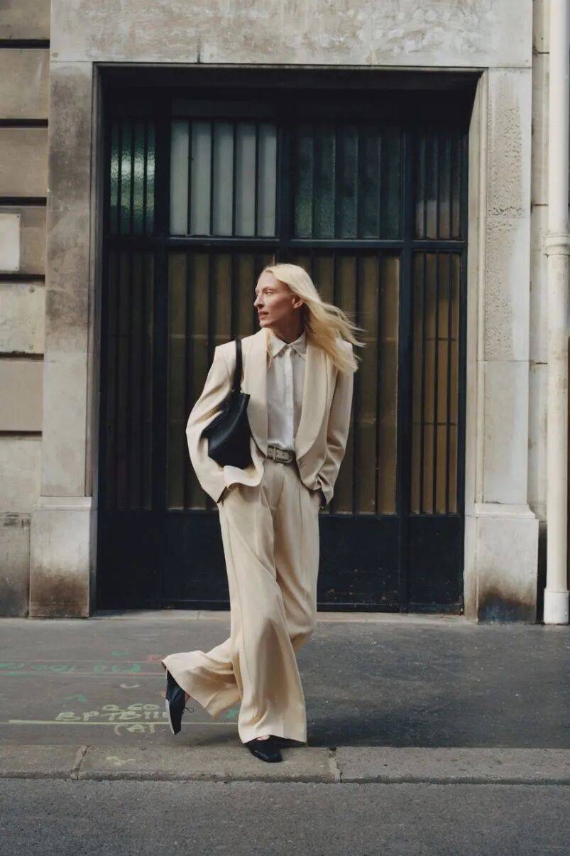 真正懂得穿奶油白的人,往往会在同色系里做文章。一件暖调的奶油白外套,搭配一条冷调的米白长裤,两种白的相遇让原本简单的搭配有了层次感,像是一幅画里有了光影的变幻。