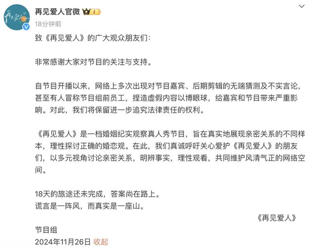 26日13时许,《再见爱人》节目组官方账号发布声明回应此事称,“自节目开播以来,网络上多次出现对节目嘉宾、后期剪辑的无端猜测及不实言论,甚至有人冒称节目组前员工,捏造虚假内容以博眼球,给嘉宾和节目带来严重影响。对此,我们将保留进一步追究法律责任的权利。”