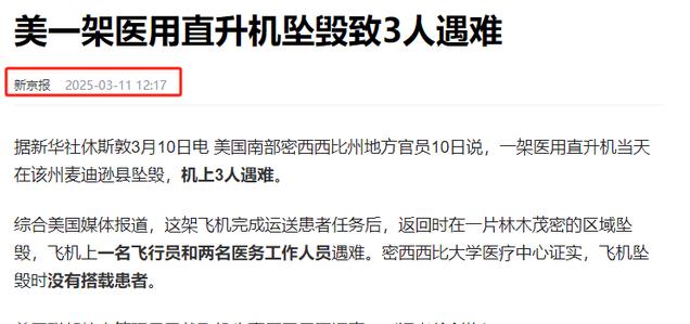 信源:新京报 2025年3月11日 关于“美一架医用直升机坠毁致3人遇难”的报道