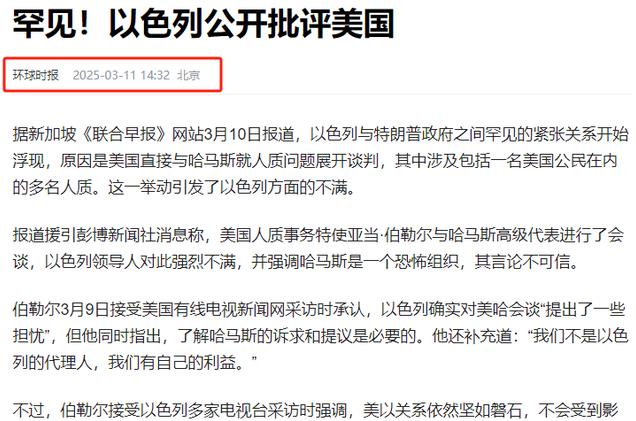 信源:环球时报 2025年3月11日 关于“罕见!以色列公开批评美国”的报道