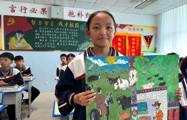 △果洛西宁民族中学学生尼东拉毛在主题思政课上展示表现现代化家乡的作品。 当代青少年,生逢盛世,离不开一代又一代人的筚路蓝缕;复兴伟业,道阻且长,离不开一代又一代中华儿女接续奋斗、继往开来。 正如几个月前,习近平总书记在湖南一师对同学们的勉励:“现在,世界又处于一个百年未有之大变局,我国正在以中国式现代化全面推进强国建设、民族复兴伟业,当代青年学子正当其时。在这个时候,我们更有责任共同把教育办好、把学生培养好,为推进中国式现代化培养一批批栋梁之材。”