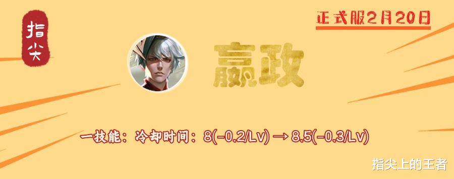 嬴政的调整就不用多说了吧,非常明显,一级增加0.5秒冷却,满级后持平。