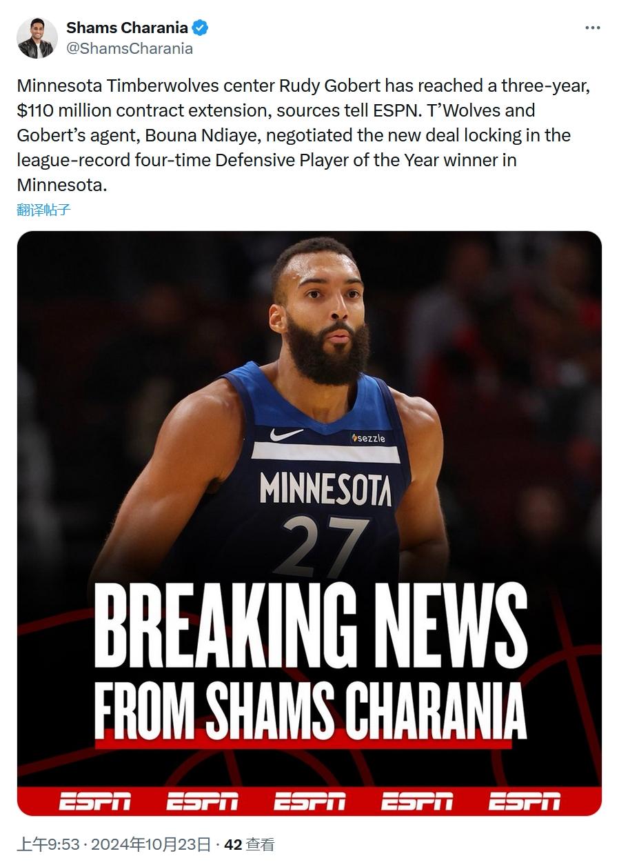 北京时间10月23日,新赛季NBA正式拉开战幕。在森林狼队与湖人队比赛开始之前,据名记Shams报道称,森林狼队中锋与球队达成一份3年价值1.1亿美金的续约合同。