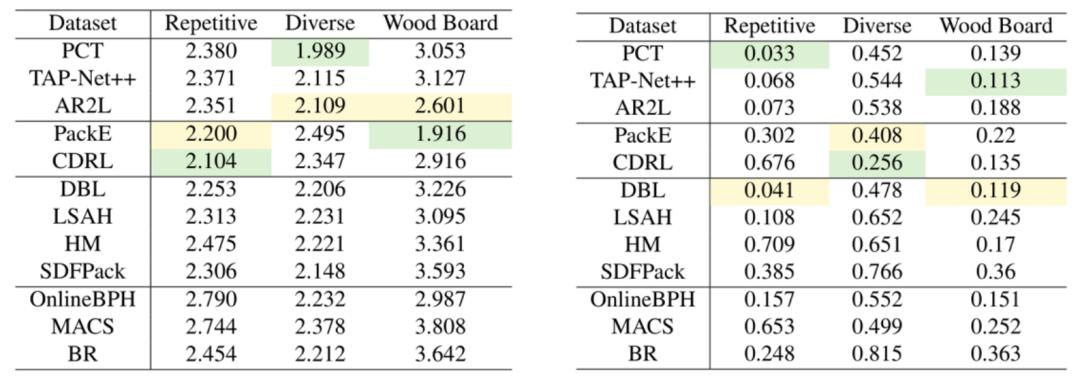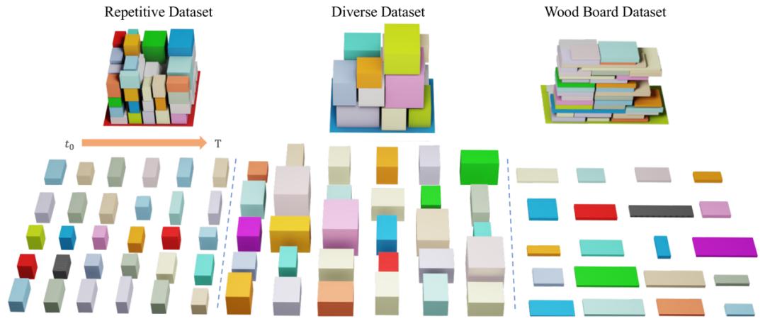 第一类场景来自流水线式生产,箱体尺寸高度重复、变化较小,由此构建了 Repetitive Dataset。第二类场景对应物流分拣与装箱任务,箱体尺寸具有较大的多样性和波动性,形成了 Diverse Dataset。第三类场景涉及形状不规则或细长的箱体,其放置难度更高,例如长条形板材,于是构建了 Wood Board Dataset。