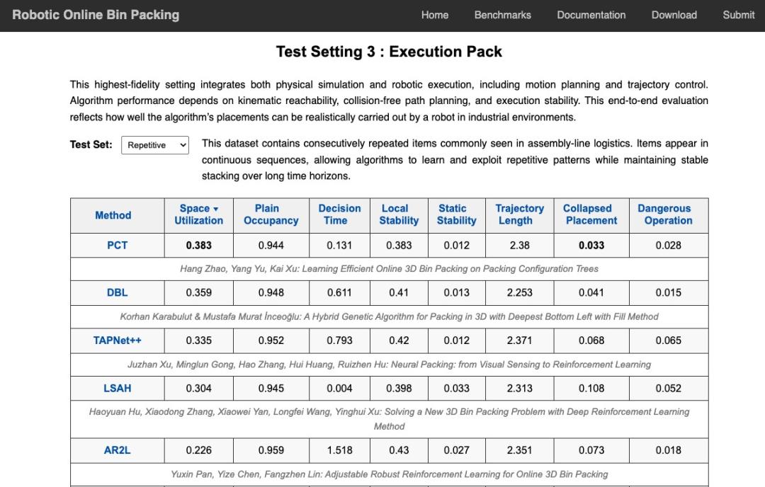 在现代工业物流与机器人自动化中,三维装箱问题(3D-BPP)的物理可行性与具身可执行性是决定算法能否真正落地的关键因素。随着工业自动化水平不断提高,「在线装箱」问题正受到越来越多关注。然而现有研究在问题设定、测试数据、评估指标等方面差异巨大,且不少先进算法尚未开源,导致研究社区缺乏一个能够公平、系统评估算法性能与真实可用性的统一基准体系。