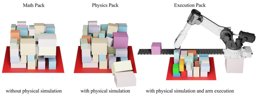 Physics Pack:在几何放置的基础上引入重力、碰撞等物理模拟,但不包含机械臂执行,用于评估算法在具身物理约束下的有效性,例如堆叠稳定性、接触关系与平衡性。