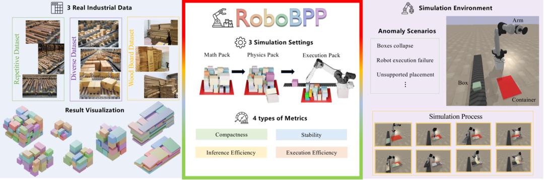 为解决这些痛点,国防科大、中科院工业人工智能研究所、武汉大学与深圳大学联合推出 RoboBPP——一个基于真实工业数据、物理仿真与具身执行建模的机器人在线装箱的综合基准系统。RoboBPP 内置基于物理的高逼真仿真器,并在仿真环境中引入真实尺度的箱体与工业机械臂,完整复现工业装箱流程。通过模拟真实工业条件,RoboBPP 能够有效评估算法在现实部署中的物理可行性与具身可执行性。