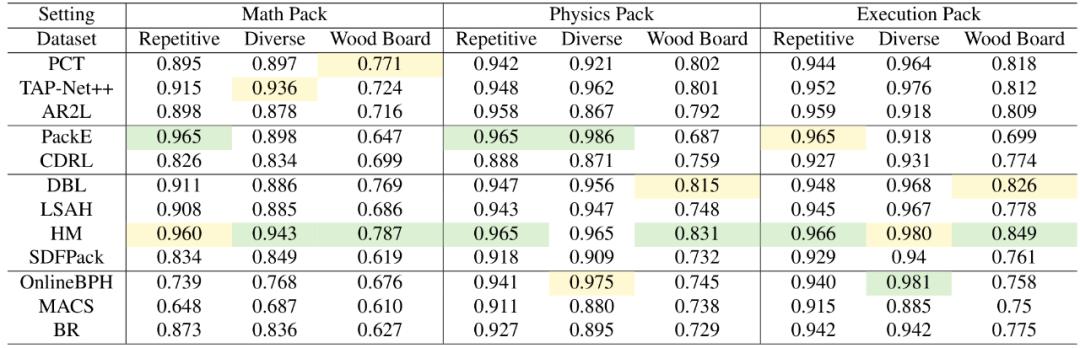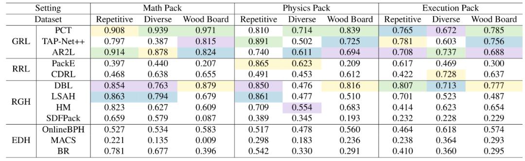 Execution Pack:最接近真实部署的评估设置,完整引入具身执行过程,结合物理仿真与工业机械臂操作,包括运动规划与控制。在该设置下,算法性能不仅取决于放置策略本身,还取决于机器人运动学可达性、无碰撞轨迹规划以及执行过程中的动态稳定性。