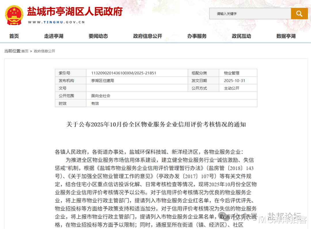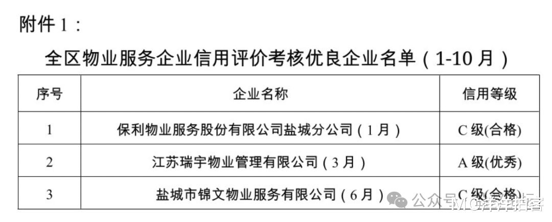 为推进全区物业服务市场信用体系建设,建立健全物业服务行业“诚信激励、失信惩戒”机制,根据《盐城市物业服务企业信用评价管理暂行办法》(盐房管〔2018〕143号)、《关于加强全区物业管理工作的意见》(亭政办发〔2017〕107号)等有关文件规定,结合住宅小区重点信访投诉化解、日常考核检查等情况,现将2025年10月份全区物业服务企业信用评价考核情况予以公布。对于信用评价考核情况为优良的物业服务企业,将上报市物业行政主管部门,提请列入市物业服务企业红名单,在今后评优评先、物业招投标等方面给予政策支持和适当加分。对于信用评价考核情况为失信的物业服务企业,将上报市物业行政主管部门,提请列入市物业服务企业黑名单,取消评优评先资格,在物业招投标等方面予以限制;同时,通报至所在街道(镇、经济区)、社区(村)、业主委员会(物管委员会)。通过信用评价考核,促使各物业企业重信誉、讲信用,加强行业自律,自觉以业主为中心,以服务为出发点,恪尽职守,诚信履约,努力提升物业服务水平,提高业主满意度。
