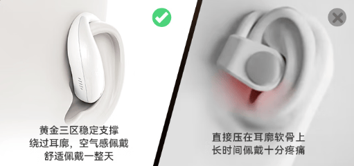 该耳机采用高弹柔韧材质,搭配眼镜避让设计,佩戴时无明显的压迫感;耳挂支持4档调节,可适配各类耳型人群。机单耳重量为10g,长时间佩戴后,耳部会产生轻微压力感。