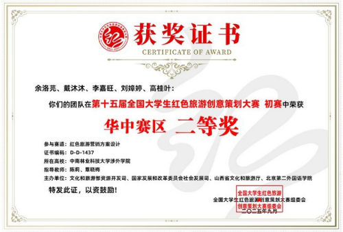 由冯婉吉老师指导,李余志、李扬、肖思节、何阳同学组成的“对对对队”荣获红色旅游营销方案设计赛道二等奖。