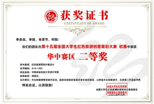 由禹文婷、彭柳依老师指导,李乐、胡耀、谢海涛、豆心怡、邹方圆同学组成的“红途筑梦队”荣获红色旅游路线设计赛道一等奖。