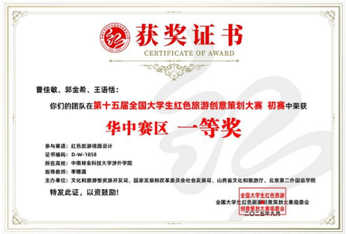由李穗菡老师指导,曹佳敏、王语恬、郭金希同学组成的“峥嵘之路探索队”荣获红色旅游路线设计赛道一等奖。