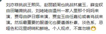 “贾母可以让萨日娜来演,或许会很贴合。”、“我觉得还不如让《知否》里的祖母来演,在《知否》里演技就很好,观众也比较熟悉。”