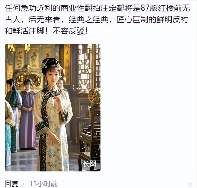 “感觉即使拍出来也不会超过87版的影响力,毕竟现在很多人一提到林妹妹,脑海里最先浮现出来的就是陈晓旭的脸。”