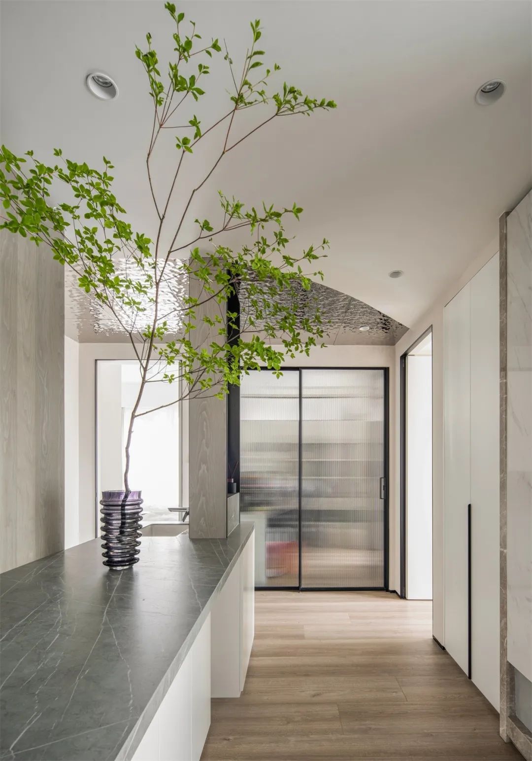 弧形吊顶和水波纹不锈钢的搭配,完美呈现了现代材料和传统建筑的联系。弧型吊顶拉高层高,不锈钢水波纹天花在光线的折射下绚烂耀眼。