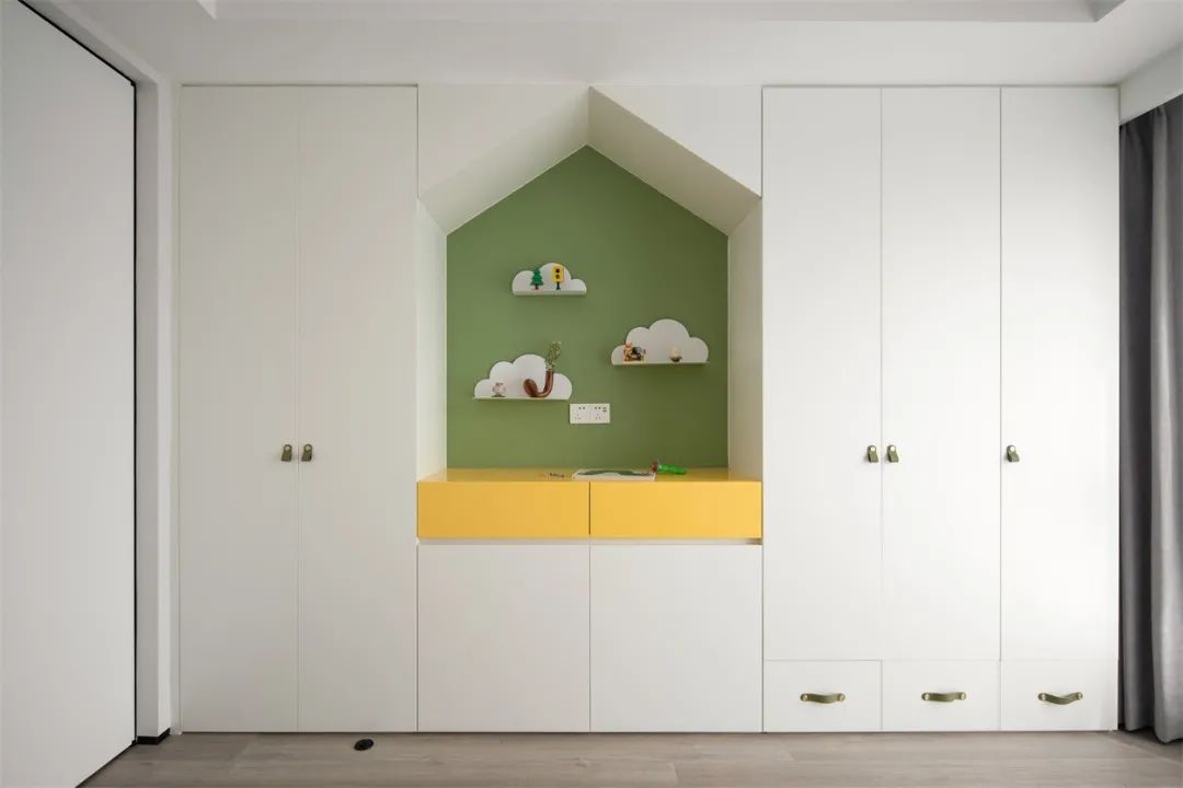 云朵床呵护了小女生的温柔乖巧,简约白色的空间用清新的黄色与绿色碰撞出活力。