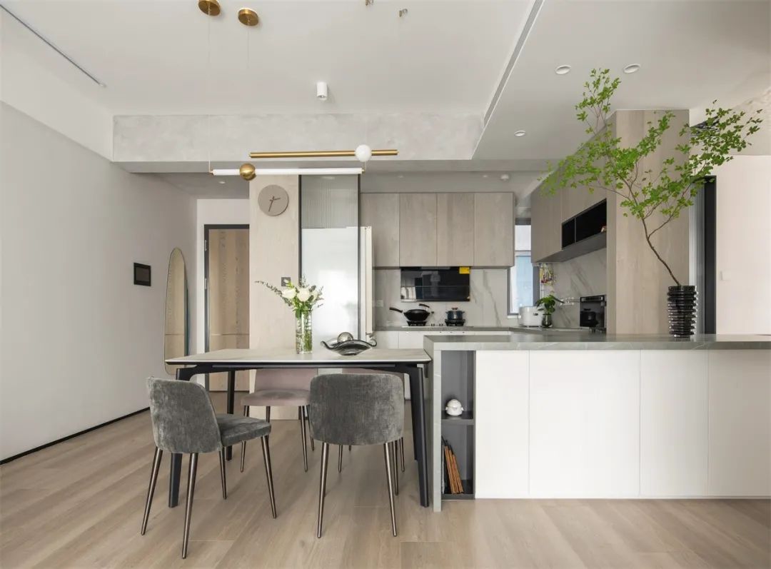 全屋通铺灰调地板,无主灯设计维护辽阔视野,奠定低调质感基调,完全开放式的餐厨区无形中放大了玄关与公区视野。