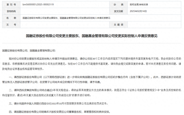 近日,证监会网站披露信息显示,对国融证券变更主要股东、国融基金变更实际控制人申请提出反馈意见。红星资本局注意到,反馈意见实际上关系到西部证券(002673.SZ)收购国融证券,且多项要求涉及西部证券。