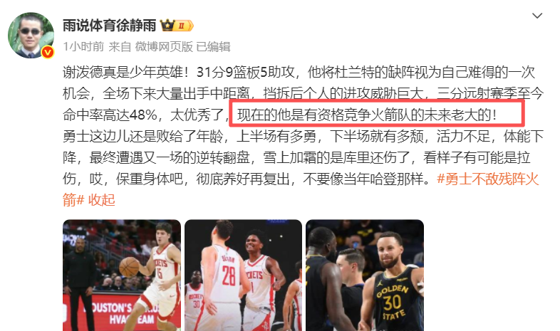 国内名嘴徐静雨就在社媒上表示,谢泼德未来可以成为火箭老大!杜兰特今年已经37岁,他再打2-3年可能就会退役,而阿门、申京、小贾巴里史密斯是火箭的建队核心,如今,21岁的谢泼德也打出来了,他比杰伦格林更好用,而且也愿意将精力放在防守端,所以未来成为火箭外线头号得分手,不是不可能!