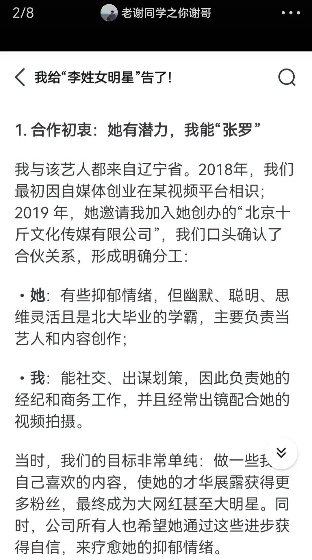 转折发生在2020年9月。随着《脱口秀大会》舞台上“宇宙的尽头是铁岭”爆火,李雪琴的商业价值呈指数级增长。公司业务从内容创作扩张到品牌代言、综艺制作,短短三个月内成立五家子公司,谢田飞兼任其中两家法定代表人。此时的十斤文化估值已破亿,而两位创始人的关系却在利益漩涡中悄然变质。