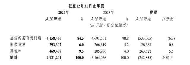 从业务线来看,奈雪的茶2024年来自直营门店的营收为41.58亿元,同比减少6.3%;来自瓶装饮料的收入为2.93亿元,同比增长0.8%;来自其他的收入为4.69亿元,同比增长5.5%。