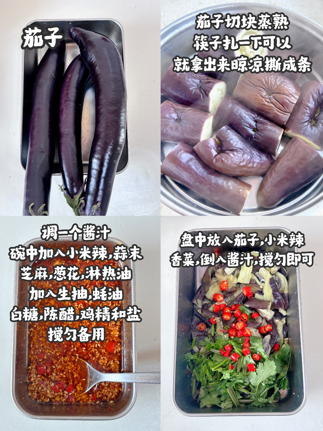 1. 🍆 **准备食材**:茄子、小米辣、蒜末、葱花、芝麻、热油、生抽、蚝油、白糖、陈醋、鸡精、盐。