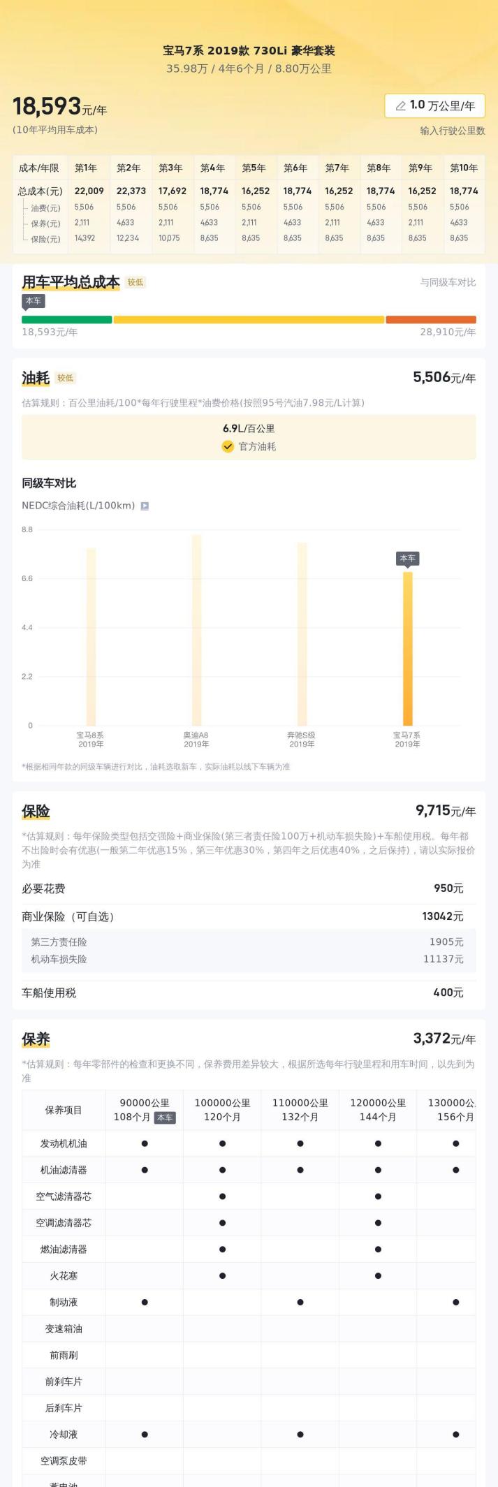 除了车况本身,养车成本也是一个需要认真考虑的问题。宝马7系的保养费用相对较高,即使是730Li,每年的保养费用也至少在1万元以上。此外,保险费用也是一笔不小的开支,再加上油费、停车费等等,每年的养车成本预计在2万元左右,甚至更高。这对于普通家庭来说,无疑是一笔不小的负担。
