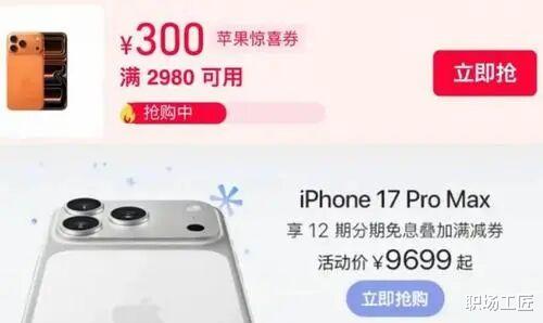 iPhone 17 Pro及Pro Max系列现在分别降价300元,降至8699元和9699元起,进一步提升了性价比。