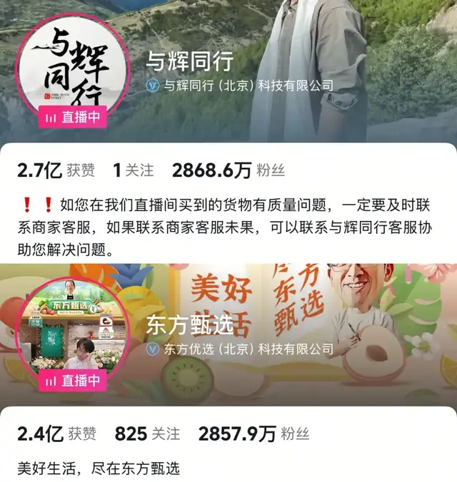 2025年4月23日晚8点36分,与辉同行浙江行的直播间,与辉同行的粉丝数与东方甄选在2895.4万这一数字上交汇。此后几分钟,与辉同行的粉丝量一路攀升,正式完成反超。