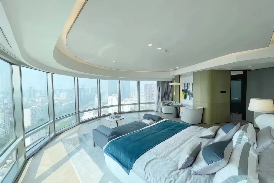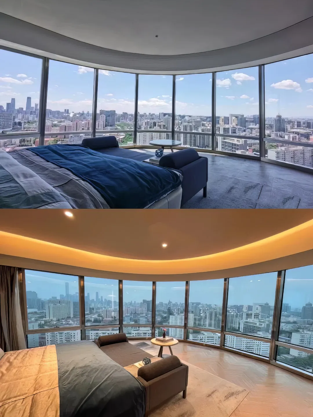豪宅的卧室同样令人惊艳。全景弧形窗的设计,不仅增加了室内的采光面积,更让躺在床上的人能够一览无余地欣赏到北京城的繁华夜景。