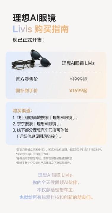 2025年12月3日,理想汽车正式发布旗下最强人工智能附件——理想AI眼镜 Livis。理想携手蔡司达成全球战略合作,Livis作为双方合作的首款落地产品,全系标配蔡司高品质镜片,并提供屈光、感光变色、墨镜等多种版本,全国统一零售价1999元起。首销月截止12月31日,可享受15%的国家补贴。12月3日起,用户可在理想汽车App商城、京东理想智能眼镜官方旗舰店下单购买;理想全国零售中心店也将陆续开放选购服务,详情可查询理想官网。12月中下旬起,蔡司天猫、京东官方旗舰店及蔡司官方授权合作门店将同步开售。