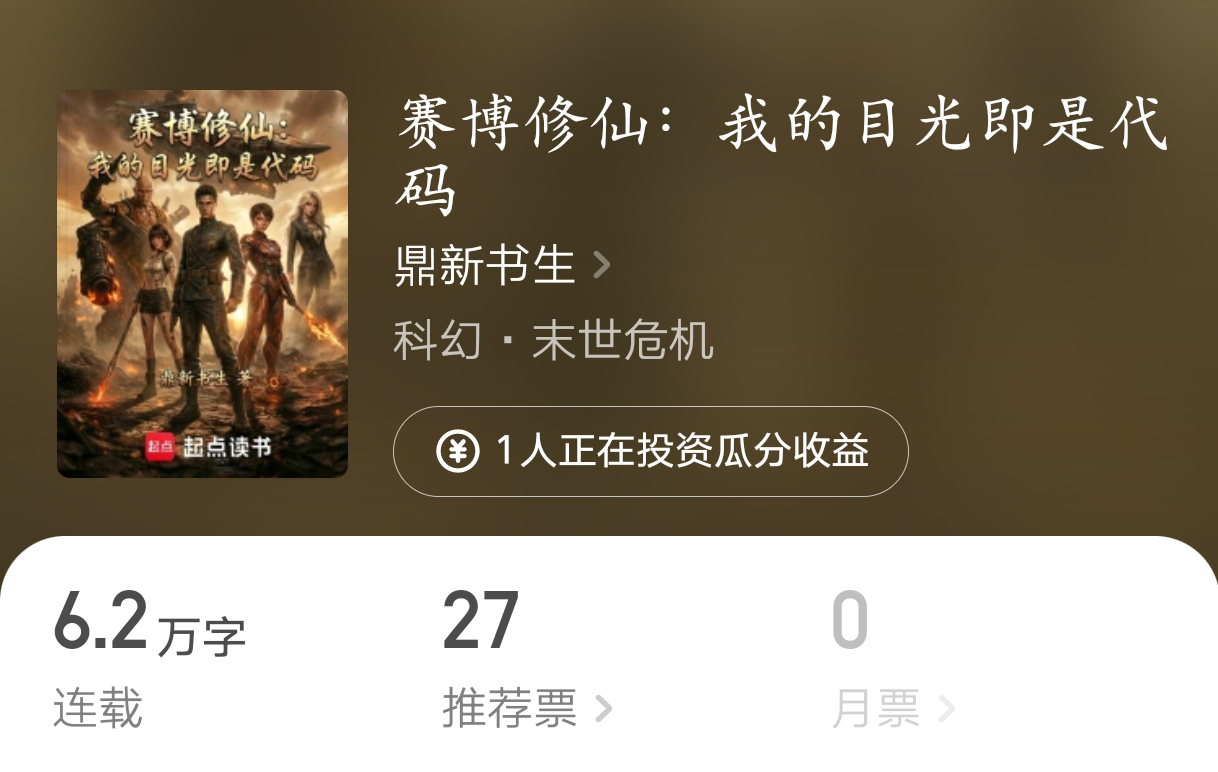 一个味很浓的赛博修仙文,作者在交代世界背景、讲述主线剧情和塑造人物形象中间完成了很不错的平衡,营造了一场紧张但不混乱的逃亡,阅读体验很不错。
