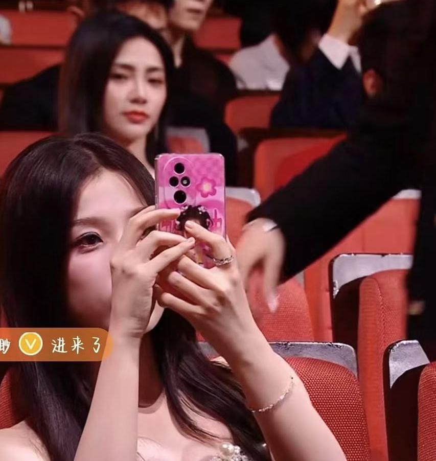 在张靓颖活动中途表演歌曲时,刘亦菲还在台下用手机拍她。