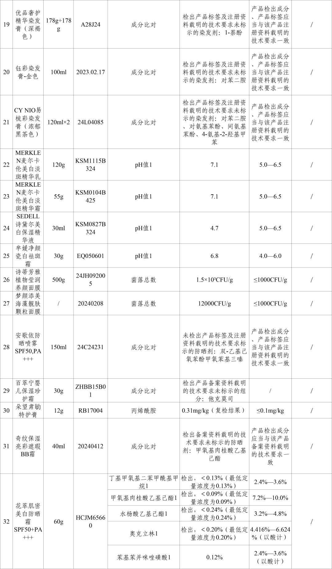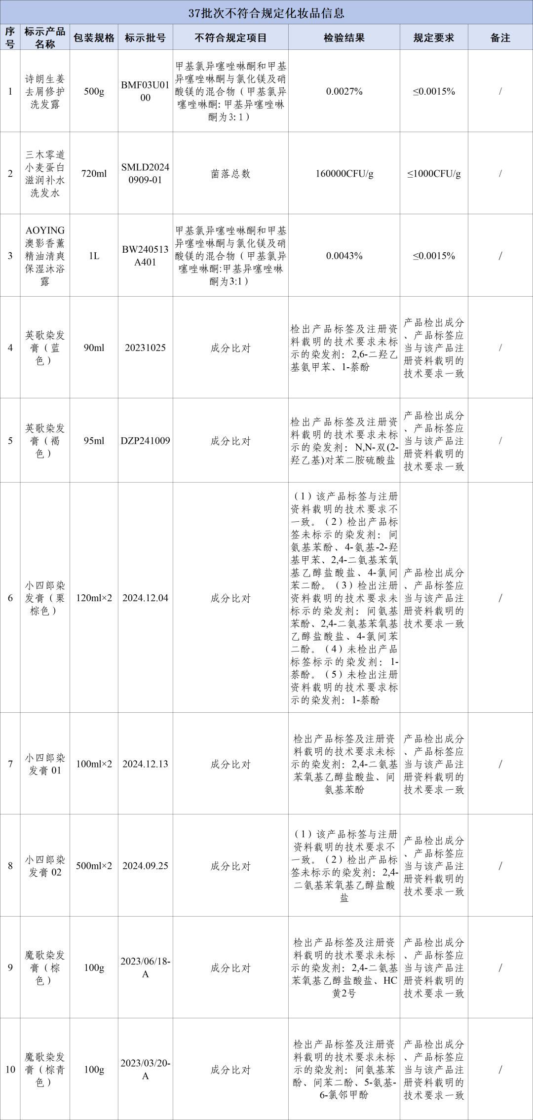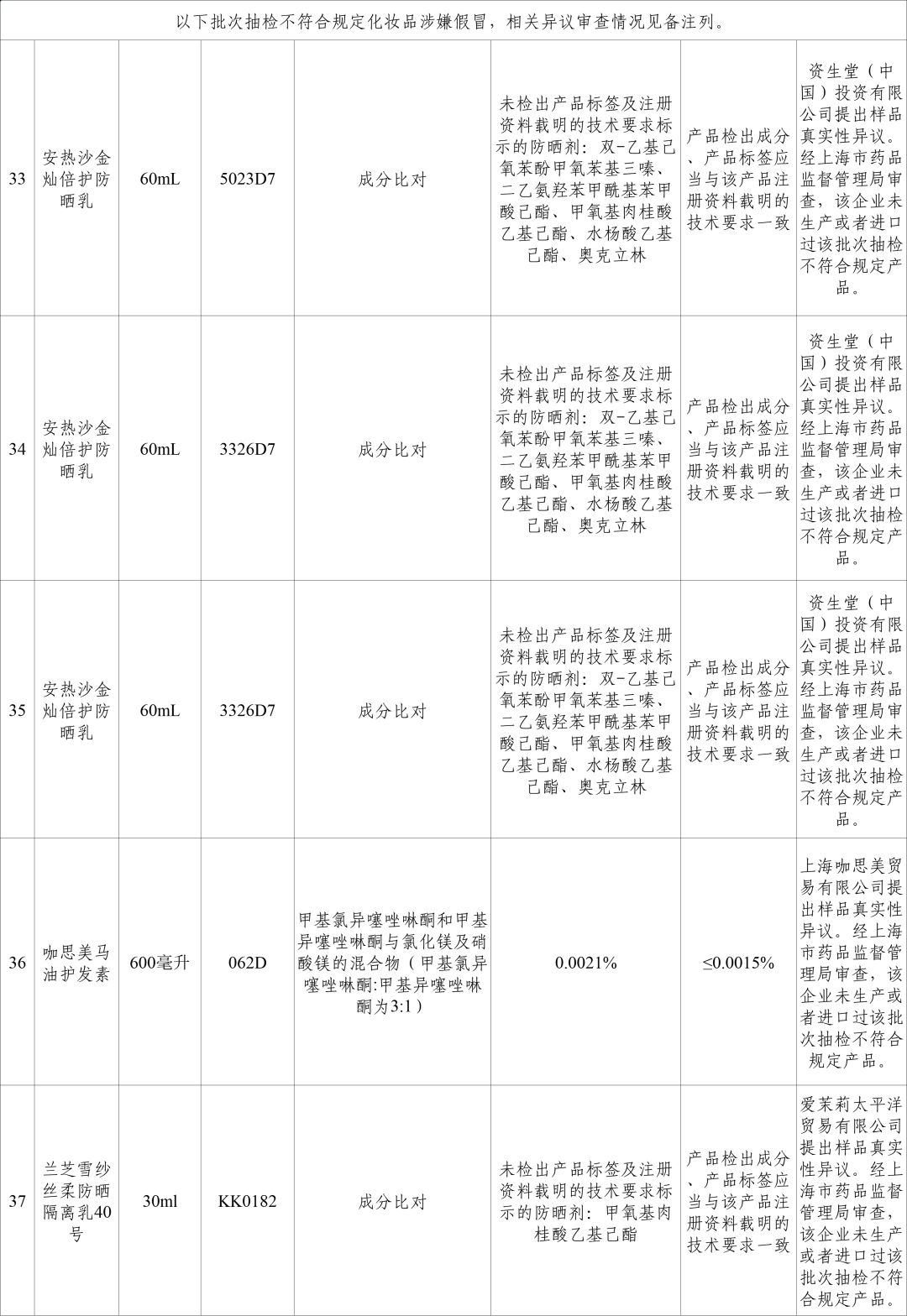 37批次不符合规定化妆品信息