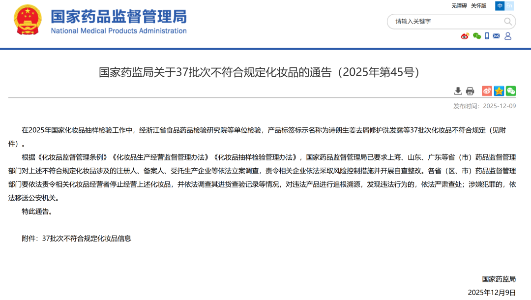 关于37批次不符合规定化妆品的通告