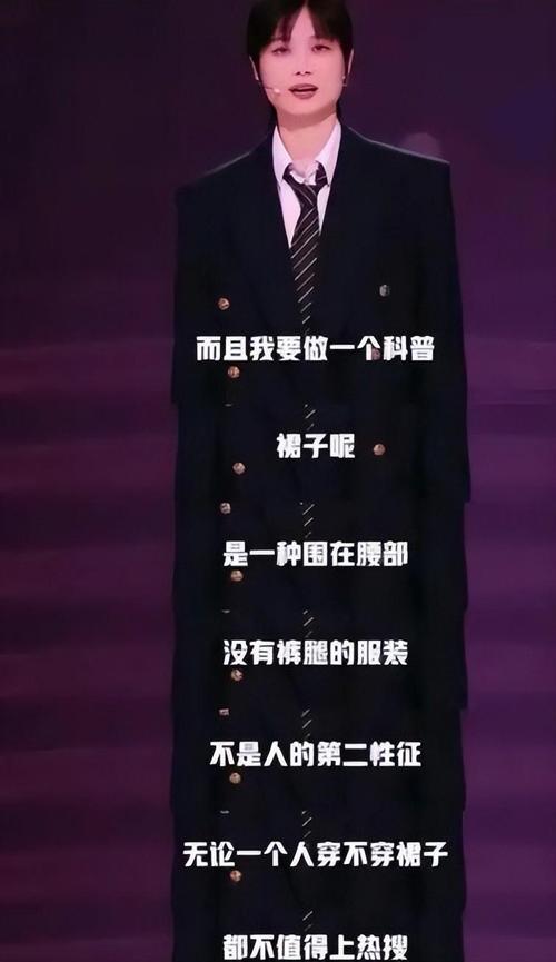 她说:“我要做一个科普,裙子本质上就是一种围在腰部没有裤腿的布料,它只是服装的一种,并不是人类的第二性征。”接着她甚至调侃起了那个困扰她多年的外号。