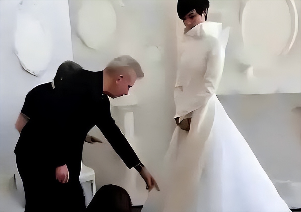 当时的李宇春穿着巨大的拖地长裙准备下台阶,因为裙摆太重行动不便,身边一位身形高大的外国保镖礼貌地伸手搀扶了一把。