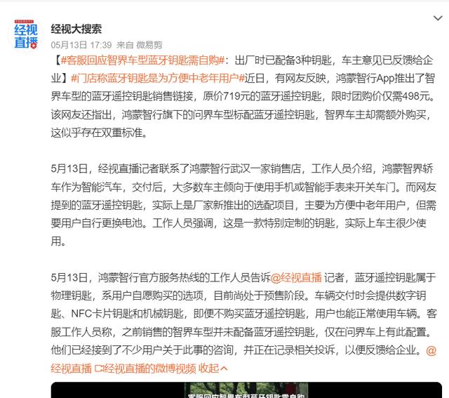 在社会媒体上,这一事件迅速引发了大量讨论。许多用户在社交平台上表达了自己的看法,认为这种差异化政策是对智界用户的不公,同时也质疑鸿蒙智行的品牌策略。不少用户质疑道:“为什么我需要为一把钥匙而额外掏钱?难道作为同一个品牌的消费者,我就不应该享受到同样的待遇?”这些声音凝聚了许多消费者对个别品牌'隐形定价'的反感情绪,甚至有人开始对智界的未来表示担忧。