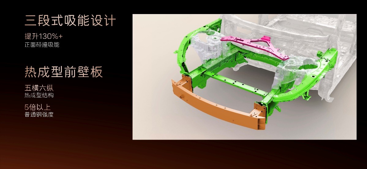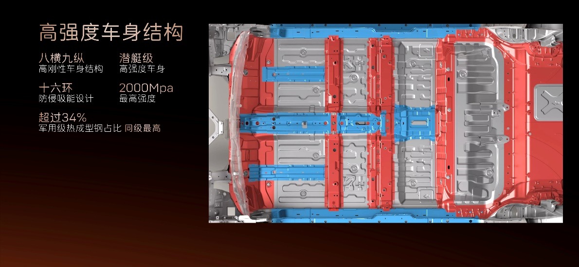 电池安全方面,电芯采用宁德时代AI 加强的第八代智能产线,累计通过150+项专项安全和性能试验,电池0起火0爆炸,达到了极高安全标准。此外,门槛梁采用全贯穿式六宫格铝型材和热成型钢三层外中内板组合设计,形成“三明治”式防护结构,外加热成型双拼座椅后横梁结构,组成三重防护结构,在遭遇冲击时高效保护电池。