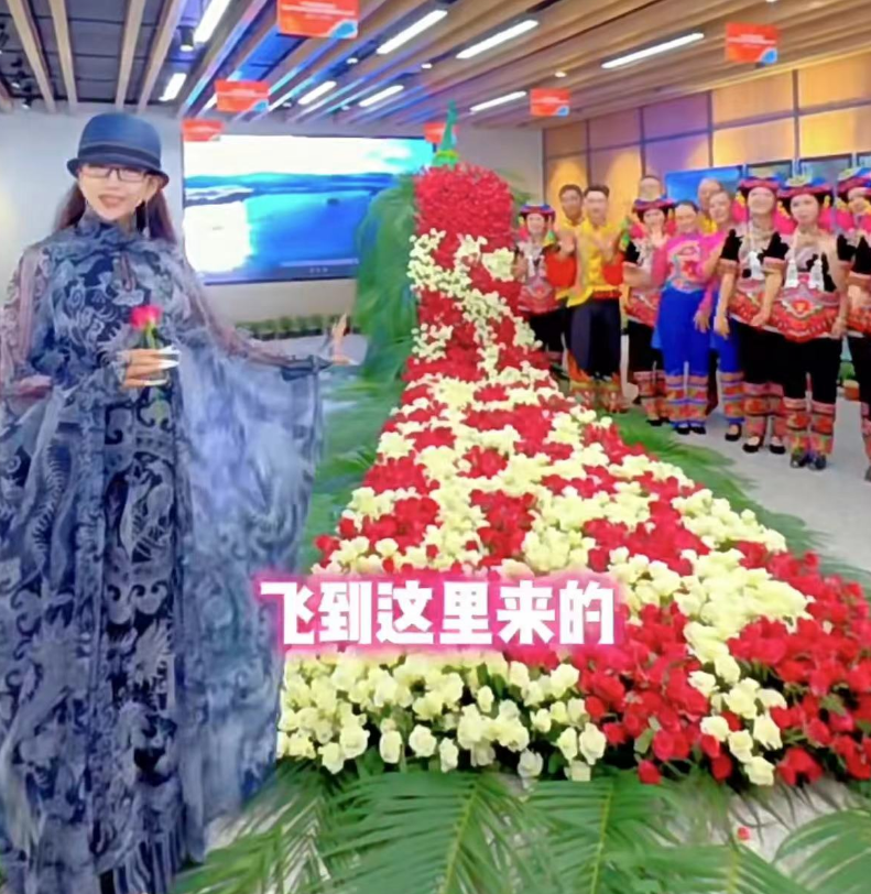 现场杨丽萍还亲自动手大秀插花技艺,借此来给广大网友送上甜蜜祝福,据了解,为了迎接杨丽萍的到来,有一位新手花艺师还运3000多新鲜玫瑰做了鲜花孔雀,成品可谓是精美至极,惹得杨丽萍也是惊叹连连,不忘在旁边摆pose合影。