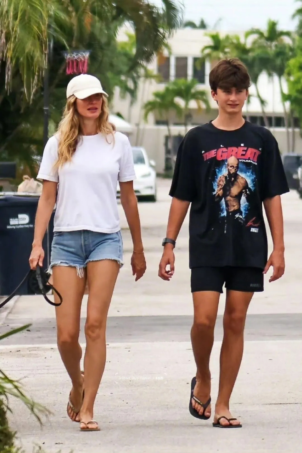 偶尔她和儿子外出一起遛狗!她穿着件简单的白色T恤搭配蓝色牛仔短裤,脚踩人字拖鞋,头戴棒球帽,也是格外的松弛自在!儿子同样的装扮,个头高高的,已经超越了吉赛尔的身高!