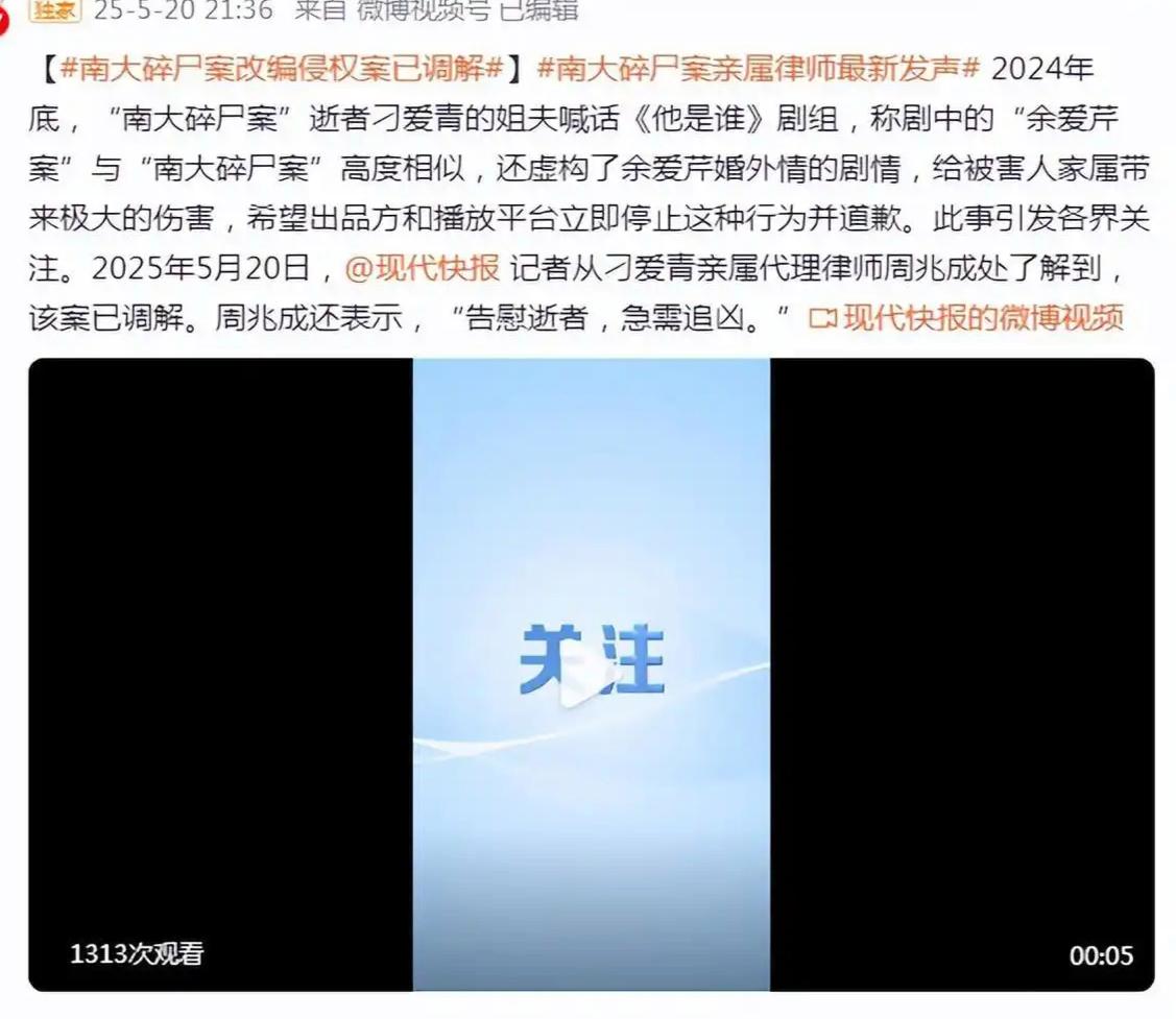 2025年5月20日,备受关注的"南大碎尸案"改编侵权案取得最新进展。据被害者刁爱青亲属代理律师周兆成透露,该案已通过调解方式解决。这起案件源于2023年热播剧《他是谁》涉嫌未经授权改编"南大碎尸案"真实案情,并对被害人形象进行不当虚构,给家属造成严重精神伤害。