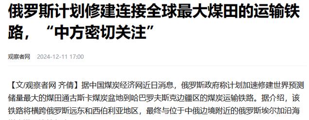 观察者网:俄罗斯计划修建连接全球最大煤田的运输铁路,“中方密切关注”