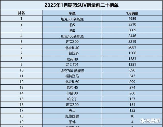 销量变化显现,乘联会近日发布1月零售数据,硬派越野SUV市场前二十榜单已出炉,为上榜车型,敬请查阅。