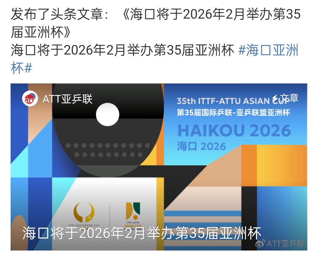 2025年12月3日,亚洲乒联官宣,确认海南海口为35届亚洲杯的举办地点,海南也是现男单世界第二林诗栋的家乡,孙颖莎有望填补职业生涯一个空白,对此很多球迷进行展望,表示会到场。