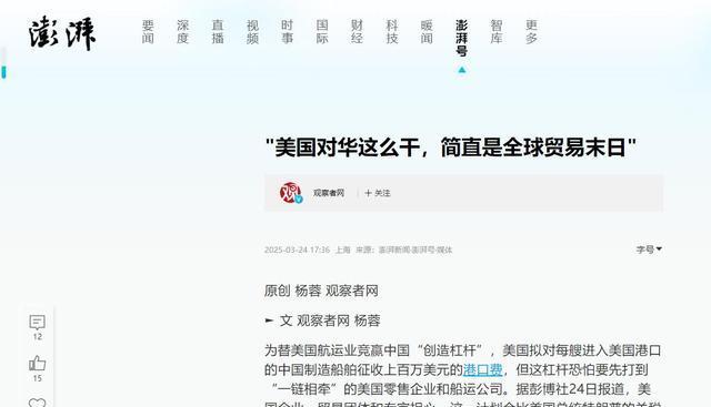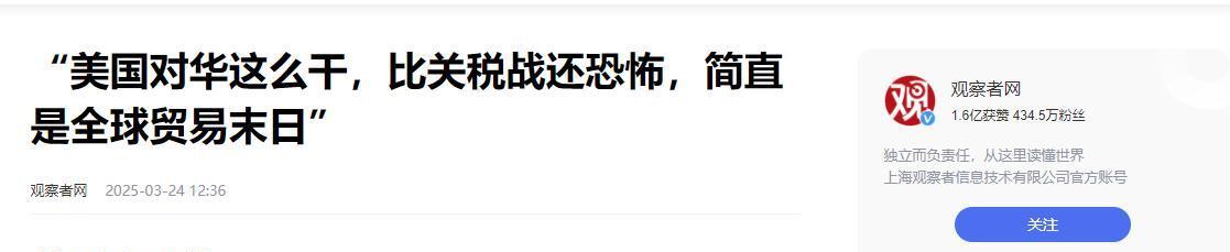 观察者网2025年3月24日消息:“美国对中国这招,比打关税战还要狠,简直就是给全球贸易判了死刑。”