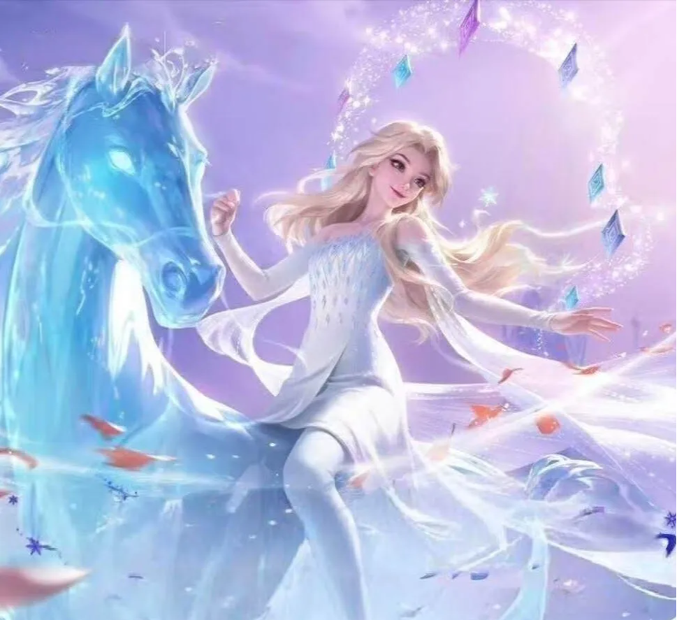 上图,是官方意外爆料的甄姬艾莎公主皮肤。能看到她穿着白色的衣裙,头上的头发也是金色的,而且她还骑着蓝色的天马,特别的有气质。